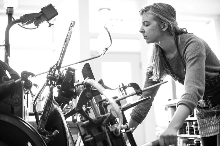 The shop houses four presses, seven lovely ladies, the occasional furry friend, and a playlist that just won’t quit.