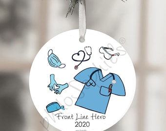 Front Line Hero, philoSophie's illustrated, 2020 COVID Christmas Ornament with Gift Box, Pandemic Gift, Medical Hero, Under 20 Dollars Gift