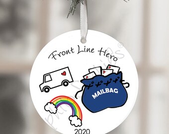 Front Line Hero, philoSophie's illustration 2020 COVID Christmas Ornament with Gift Box, Pandemic Gift, Mail Carrier, Under 20 Dollars Gift