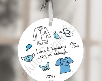 Covid Christmas philoSophie's illustrated, 2020 COVID Ornament with Gift Box, Pandemic Gift, Medical Heros, Under 20 Dollars Gift