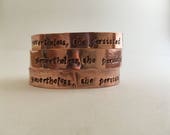 5 out of 5 starsI had a great time working with Lizzy to create this custom cuff bracelet. She was enthusiastic, helpful and very responsive - plus, the turnaround was so fast! I love the finished product. The materials and construction are super durable, I have worn it since I got it (except during Kettlebell class). So comfortable, and I love being able to wear this sentiment every day. Thank you again!!