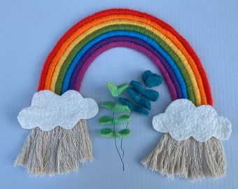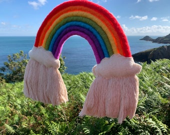 Large macrame rainbow wall hanging with stuffed felt clouds, macrame rainbow, rainbow wall hanging