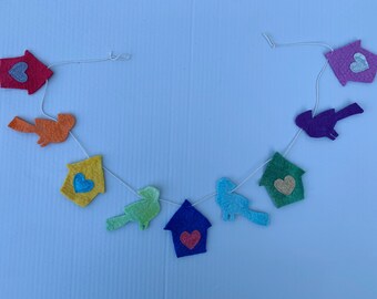 Felt bird and birdhouse garland, bird bunting in bright rainbow colours, birdhouse garland