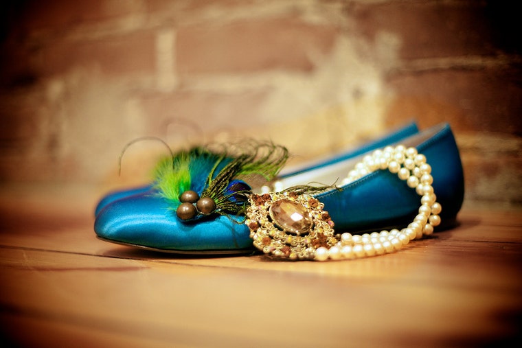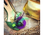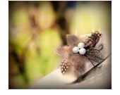 A collection of hand-made bridal accessories, shoe clips, hair pins, brooches, flower and feathered fascinator head pieces.