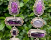 5 out of 5 starsPerfect, quirky, truly beautiful long pink and purple asymmetrical earrings. I love the stones and the design and will enjoy wearing them.