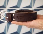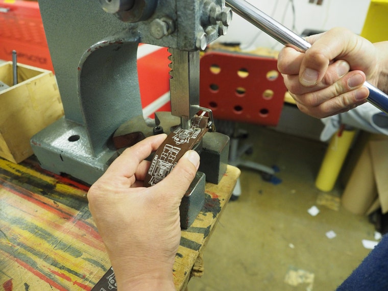 After cutting the leather and screen printing we rivet the buckle to the belt, this is our robot print belt -