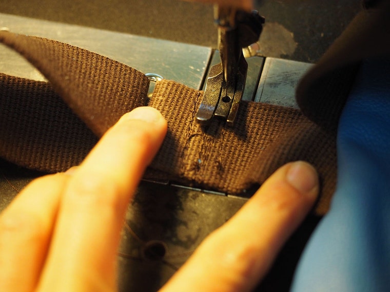 Sewing a webbing strap. We have 5 sewing machines from standard domestic to heavy duty industrial leather machines -