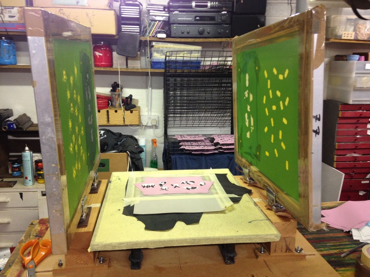 Our printing board and stands/ contraption for two colour screen printing leather work. -