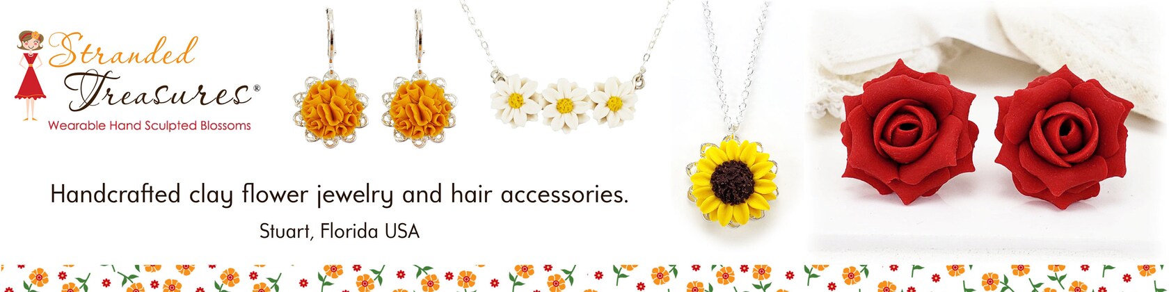 Stranded Treasures is an original jewelry collection established in 2006 by clay artist and designer Sharlene Maher. Offering an extensive range of floral styles, from minimalistic to intricate, her products have become popular as symbolic special gifts and delicately styled accents for formal and everyday wear.