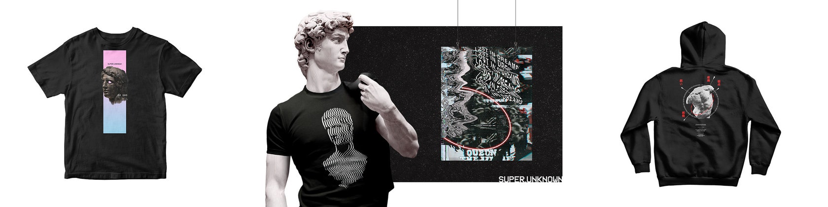 Super.Unknown is a Europe based visual art and clothing designer with symbolic, post-vaporwave and esoteric designs, and has been known to collaborate with other designers to create exclusive clothes of limited quantity. Many of the designs portray glitch edits of roman and greek sculpture aesthetics and capture the essence of vaporwave, dark visions and the complexity of the decay