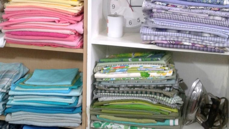 A small sampling of my thrifted fabrics that used to be vintage sheets or repurposed clothing. -