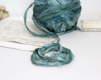 Recycled Sari Ribbon ,by the yard, "Ancient Jade" hand dyed chiffon ribbon, jewelry making, doll clothing, spinning supplies