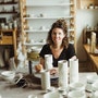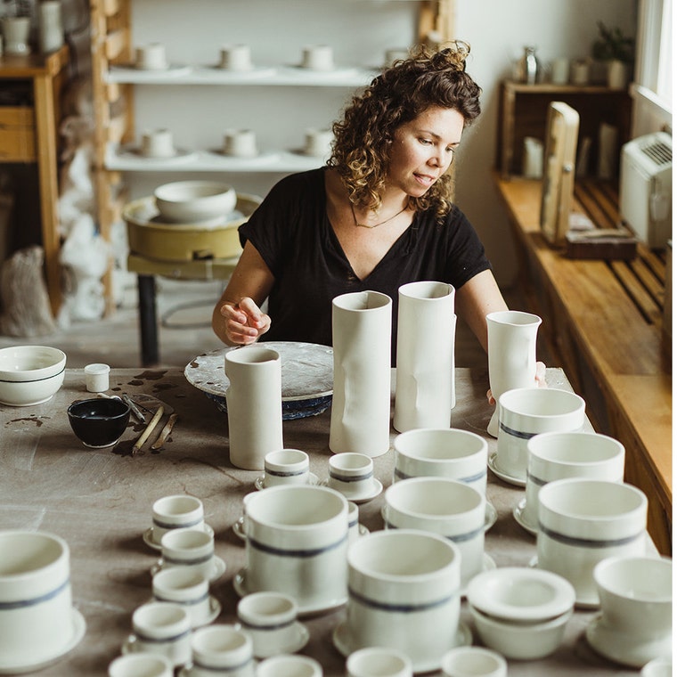 I started Taylor Ceramics in 2008, 7 years after getting my BFA in ceramics from the University of Delaware. Interested in a variety of construction methods, I divide my time between working on the potter's wheel and hand building with slabs using mostly porcelain, sometimes stoneware. I work within a group of forms that are consistent but that also allow for elements of spontaneity. The The element of LINE is a consistent thread in my functional wares - sometimes literally through the addition of stitched linen thread and often through the additional or subtraction of clay on the surface of a piece. I keep my color palette simple- I use a glaze called coke bottle clear on almost everything which is a transparent glaze with a hint of blue-green. This creates a cohesive look and allows me to almost exclusively focus on the subtle sculptural and linear details of each form.