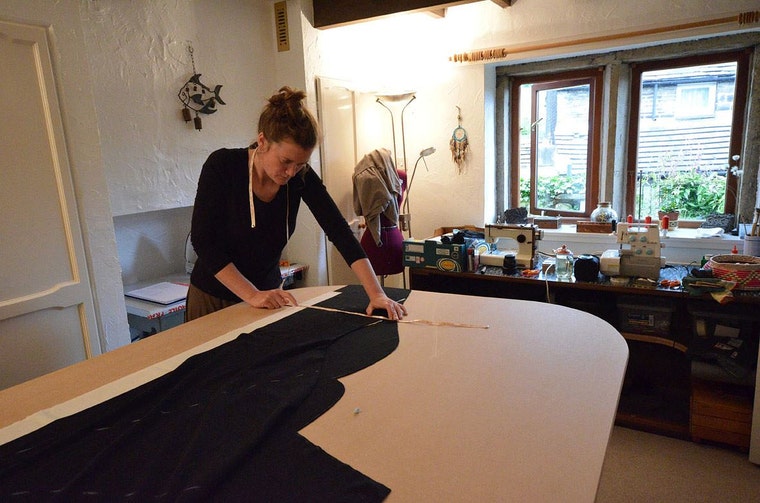 'Nadat ik Bobkin (General Morale Officer & schrijver van dit verhaal) haar ochtendborstel en ontbijt heb gegeven, vind ik het leuk om te mediteren of een wandeling te maken in de wilde Pennine-heuvels voordat ik de komende dag induik. Dit helpt me om de dag te beginnen met een kalme en heldere geest, wat betekent dat ik me kan concentreren op de taken die voor me liggen zonder afleiding. Omdat elk ontwerp op maat is gemaakt voor het individu, is het erg belangrijk voor mij om een evenwichtige en attente geest te hebben, zodat ik volledige aandacht kan geven aan het knippen en naaien van elk kledingstuk. Ik vind het van het grootste belang dat ik elke klant een perfect kledingstuk aanbied dat ze nog lang zullen koesteren en dragen.'