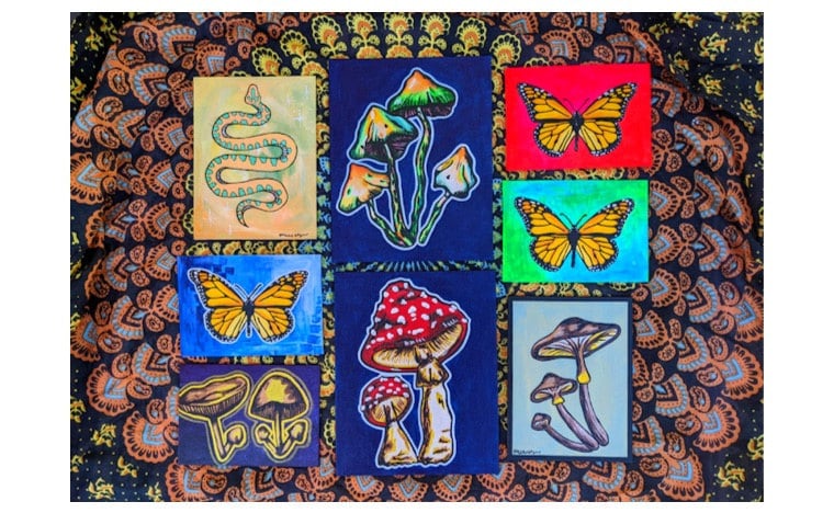 I’ve been drawing and painting mandalas for about 10 years, but about a year ago finally expanded into painting other subjects, starting with mushrooms and butterflies. I believe all plants and animals have a spirit and a message to share with us. The mushroom teaches us about change and community, the snake teaches us about cycles of death and rebirth by shedding its skin, and butterflies teach us about transformation and not rushing the process. My artwork is made to serve as a visual reminder, or a conduit, to help you tap into the essence of the mushroom or butterfly or whatever you choose.
