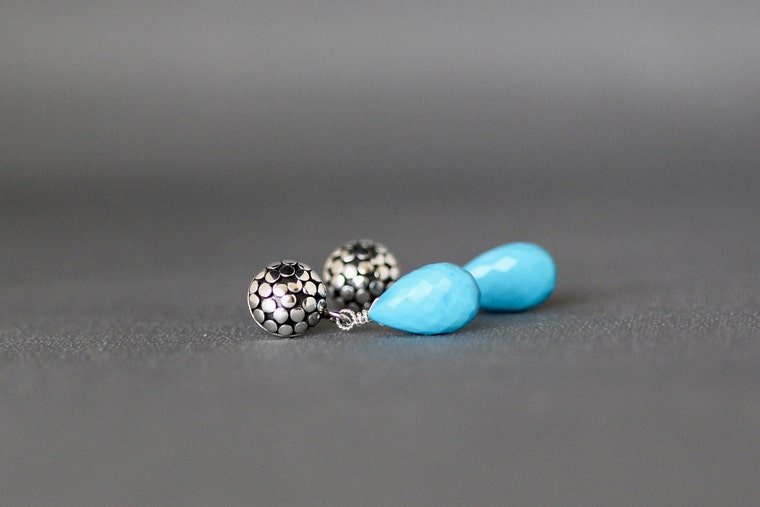 Bali Silver post earrings with micro faceted Turquoise teardrops. -