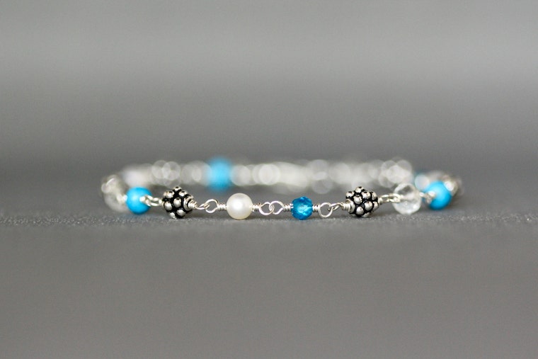 Teal Apatite, Clear Quartz Crystal, faceted Turquoise, freshwater pearl, and Bali Silver bracelet. -