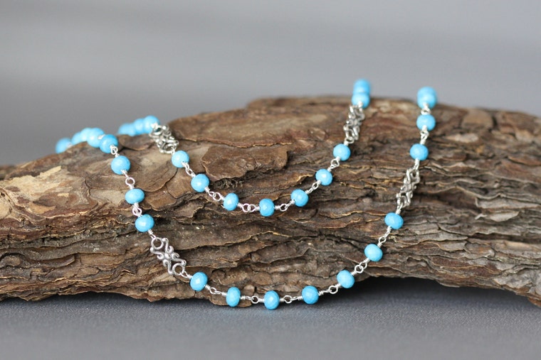 Faceted Turquoise and Bali Silver long chain necklace. -