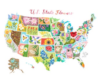 US State Flowers | Educational Wall Art | Watercolor Geography | Flower Chart