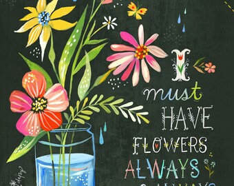 I Must Have Flowers in Black art print | Monet Quote | Hand Lettering | Floral Illustration | Inspirational Wall Art | Katie Daisy | 8x10