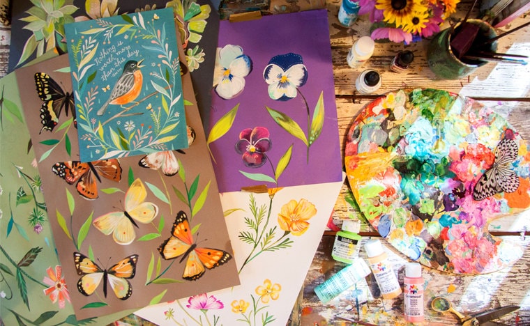 Raised by the birds & warm breezes of Lindenwood, Illinois, Katie grew among the wildflowers with roots planted deeply in the natural world. Working in watercolor & acrylic paint, Katie strives to create messages of hope, joy, and kindness.