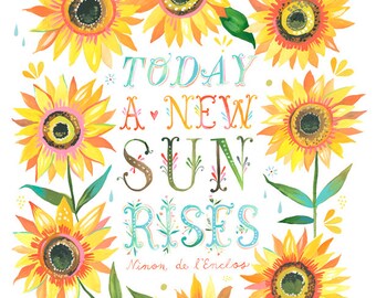 A New Sun Rises Art Print | Watercolor Quote | Inspirational Print | Lettering | Sunflower | Katie Daisy | Wall art | 8x10 | 11x14