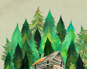 Home in the Forest | Cabin Painting | Watercolor Wall Art | Katie Daisy | 8x10 11x14