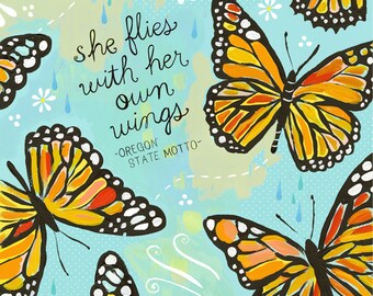 She Flies With Her Own Wings Paper Print | Inspirational Wall Art | Hand Lettering | Butterfly Art | Katie Daisy