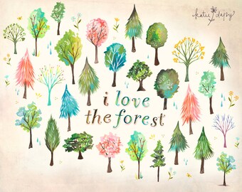 I Love The Forest Art Print | Watercolor Quote | Nature Wall Art | Outdoorsy | Hand Lettering | Katie Daisy | 8x10 | 11x14