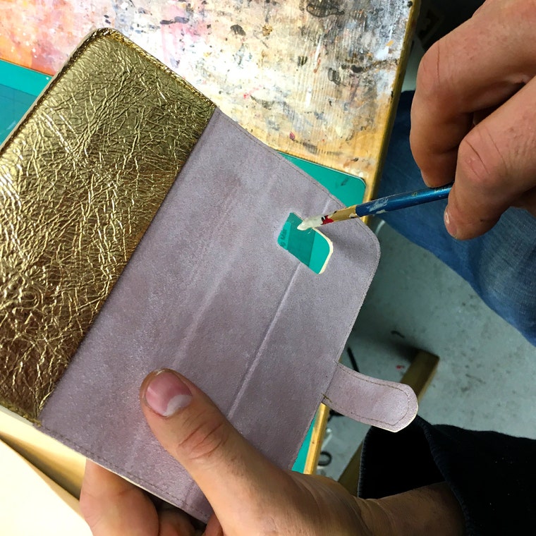 Edge painting the inside of a gold leather and pink suede phone case. -