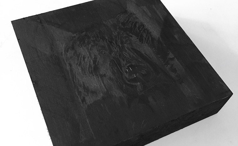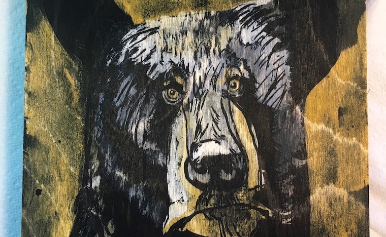 When the water-soluble gouache painting is finished, I cover the entire painting with water resistant ink. When the ink is dry I wash it, and much of the gouache, off. The Ink sticks to the paper or other substrate, the gouache washes off.