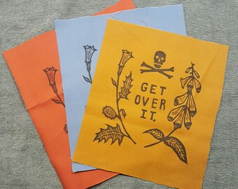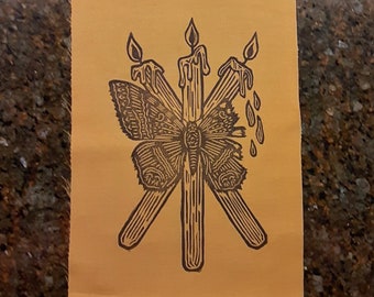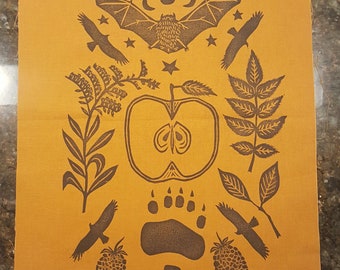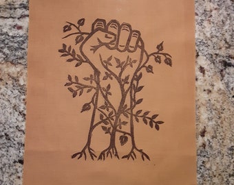 hand carved, hand printed block prints inspired by the resistance, plants, animals, folklore, and struggles with mental health