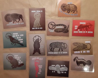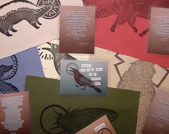 Announcement hand carved, hand printed block prints inspired by the resistance, plants, animals, folklore, and struggles with mental health