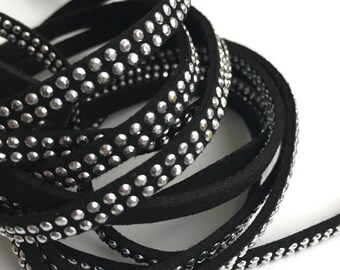 5mm Black Faux Suede Leather Cord, Black Suede Cord with 2 Rows Rhinestones, Black Suede with Silver Studs S 40 241