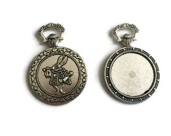 2 Cabochon Setting, Alice Rabbit Blank Bezels, Antique Silver Plated Alice in Wonderland Pocket Watch P 30 084