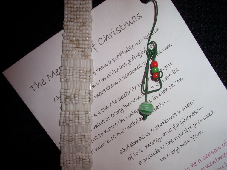 Some earlier efforts/favorite items. My first beaded bracelet. My Christmas gift tag writing. A favorite wire design. -