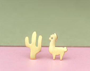 Tiny Alpaca and Cactus Earrings Llama Studs sterling silver Sheep gold studs Minimal Jewelry Kids Teen gift for her mom valentine