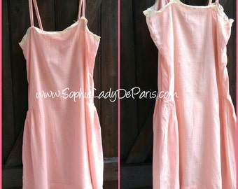 1930's Pink Salmon Slip Lace Trim French Handmade Cotton Lingerie Medium Size #sophieladydeparis