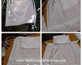 Vintage white French Maid Apron Floral Embroidered Eyelet Lace Bottom Cotton made #sophieladydeparis