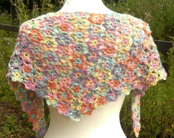 Lorna measures approx. 88 inches along the top edge by 31 inches from the centre top to bottom point and is made of a total of 94 motifs, 68 are hexagonal, 16 are triangular and 10 are half hexagonal.