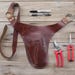 Made from high quality oil tanned leather that is both supple and durable with a deep chocolaty brown luster. All buckles and rivets are made of solid brass- won't rust!