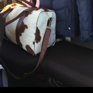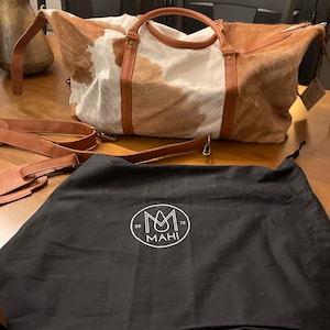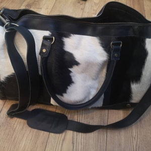 Leather Cowhide Compact Holdall Duffle - Animal Print with Natural Fur - Weekend/Overnight Bag in Brown & White Cow Print Pony Hair by MAHI