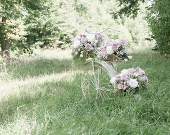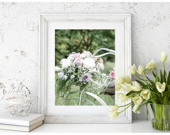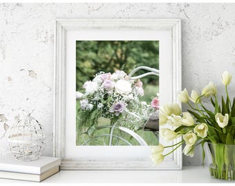 Set of three Vintage bicycle flower photography prints, Bikes and flowers pastel photography wall decor, Botanical shabby chic pink decor