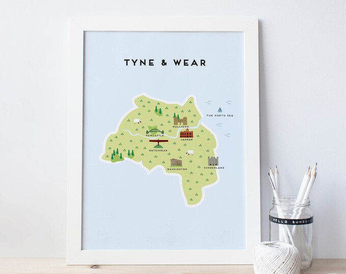 Tyne and Wear Map - Illustrated Map of Tyne and Wear Print / Travel Gifts / Gifts for Travellers / United Kingdom / Great Britain