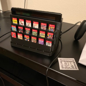 This 3D printed Nintendo Switch game card holder slips onto the front of the standard Nintendo Switch charging dock to display your library of Switch games. The low profile holder grips on tightly and stays attached to the dock so you can move the holder around with the dock easily. By storing your game card library at the front of the dock you'll be able to display up to 12 or 24 cards with all of the labels visible, keep the games easily accessible, keep the back of the Switch dock clear, and you'll do it with minimal extra space used where you keep your Switch dock. Of course, the dock is still fully functional allowing you dock/undock the Switch and attach/remove the Joycon without the holder getting in the way.