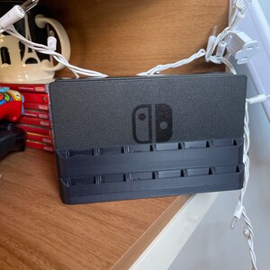 I designed this holder to be elegant, unobtrusive, and functional. Printed on my 3D printer in PLA plastic. Since this is a 3D printed object it will have bands of plastic layers and other small imperfections inherent in the manufacturing process. This display prints very cleanly and blends in very nicely with the Nintendo Switch dock.