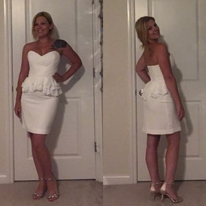 Short simple two piece wedding dress, Modern wedding separates, Draped top with asymmetrical peplum, Short white skirt, Contemporary bridal