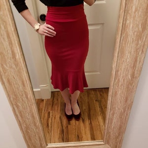 -It is custom made with Brazil Knit Jersey available in 3 colors (Black, Red, Ivory) making the skirt soft and stretchy. Note: With the Ivory color fabric make sure to wear nude colored underwear as anything else shows a shadow underneath.