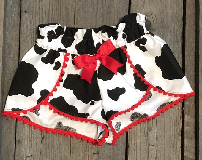 Black and White Cow Print Shorts with Red Pom Poms