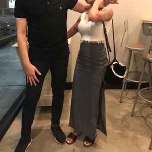 I love this skirt! I got an XXS and it fit perfect, size up for a less hugging fit. The slit goes up to my mid thigh. The linen is soft and durable. I’m 4’11 and my waist is 23-24 for reference